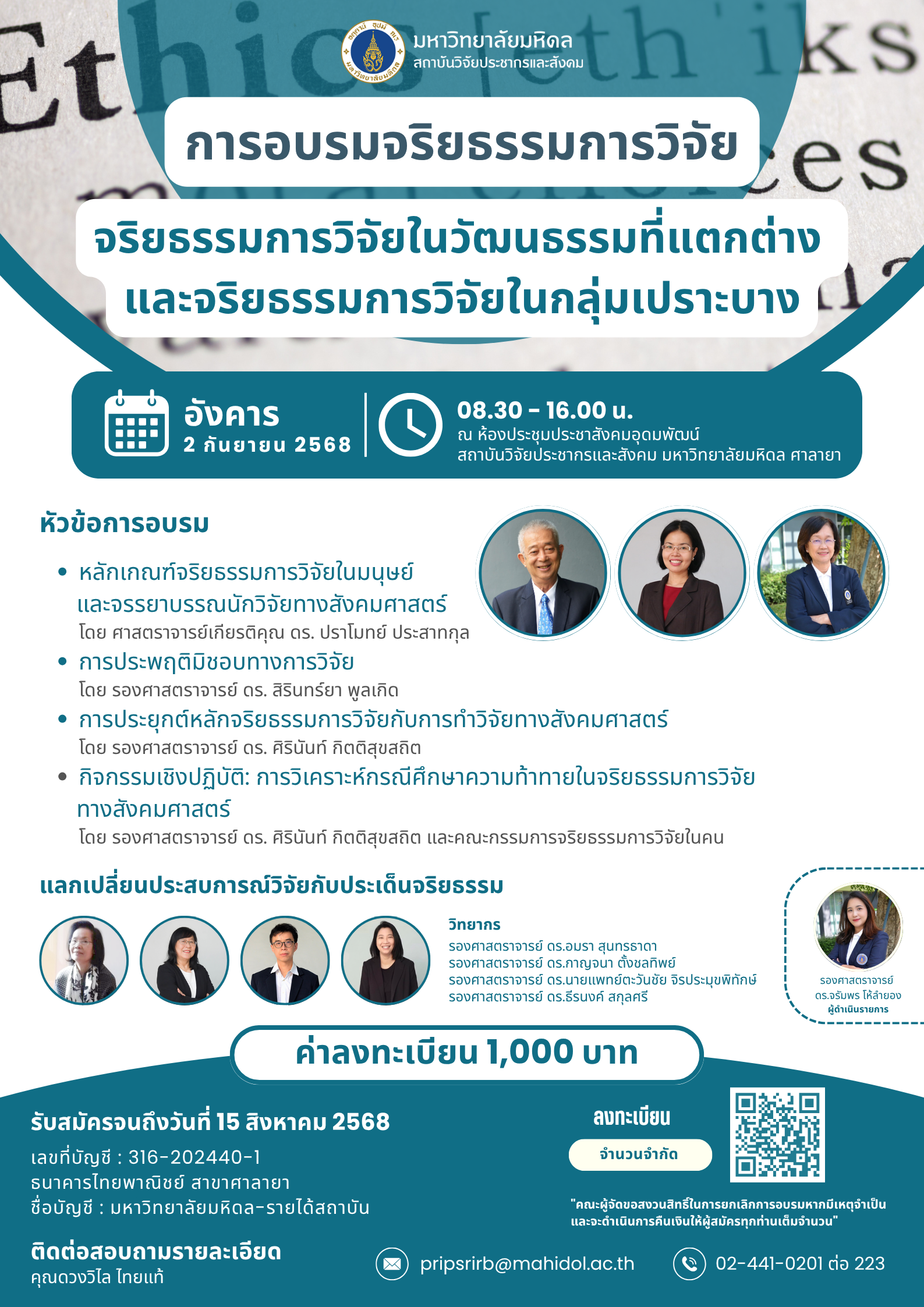 ขอเชิญชวนผู้สนใจ เข้าร่วมการอบรมเชิงปฏิบัติการจริยธรรมการวิจัยในคน